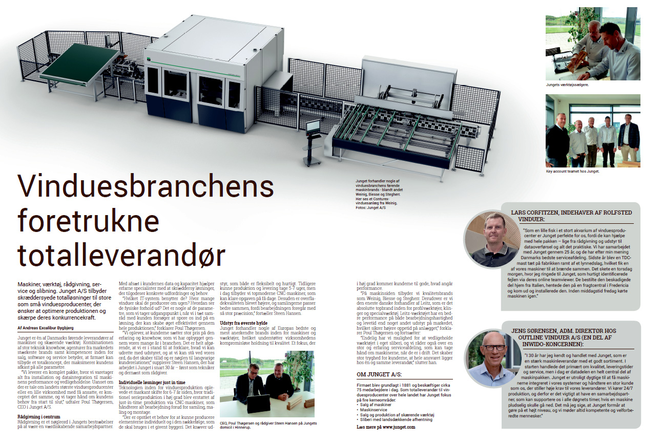 ”Vi leverer en komplet pakke, hvor vi varetager alt fra installation og dataintegration til maskinens performance og vedligeholdelse. Uanset om der er tale om landets største vinduesproducenter eller en lille virksomhed med få ansatte, er konceptet det samme, og vi tager hånd om kundens behov fra start til slut,” udtaler Poul Thøgersen, CEO i Junget A/S.