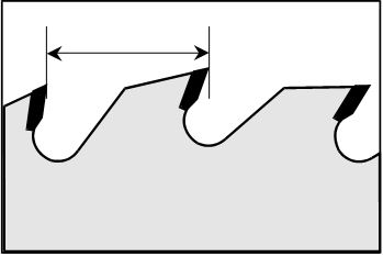 For- og efterskærende tænder. Hver anden tand er trapezslebet, og hver anden slibes lige, så spånen deles i tre stykker.