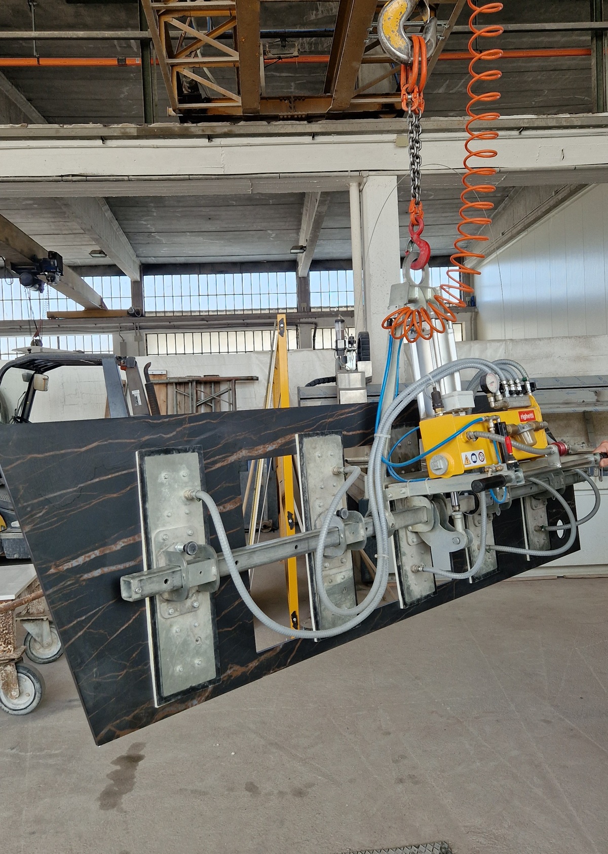 P5A550K er en del av Righetti P5A-K-serien – en pneumatisk vakuumløfter med 5 sugeplater og 0–90° tilt for sikker håndtering av kjøkkenbenkeplater og andre aflange steinplater i ikke-porøse materialer.